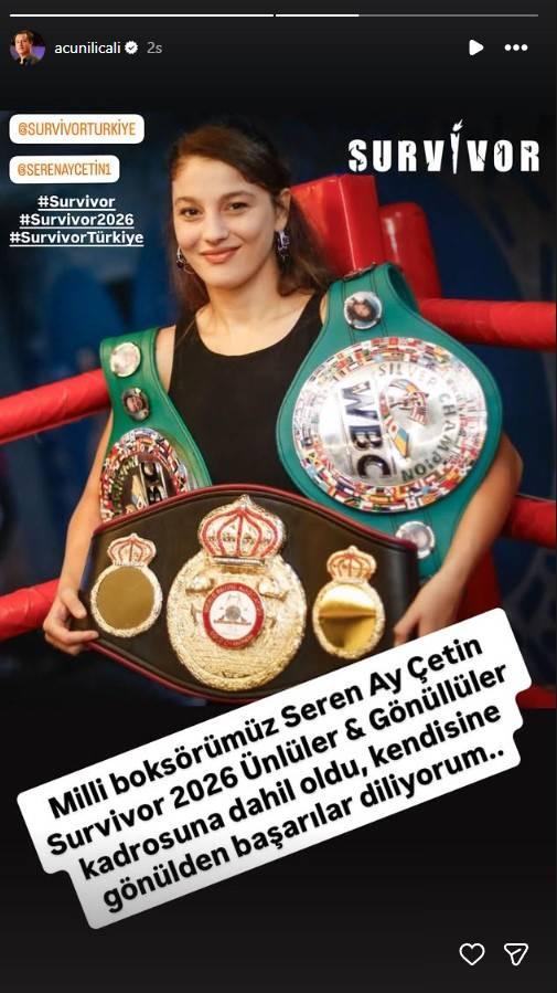 Ünlü televizyoncu Acun Ilıcalı, Survivor 2026’da yer alacak 10’uncu yarışmacının milli boksör Seren Ay Çetin olduğunu duyurdu. Yaptığı duyuruya “Milli boksörümüz Seren Ay Çetin Survivor 2026 Ünlüler-All Star kadrosuna dahil oldu. Kendisine gönülden başarılar diliyorum” notunu düştü.