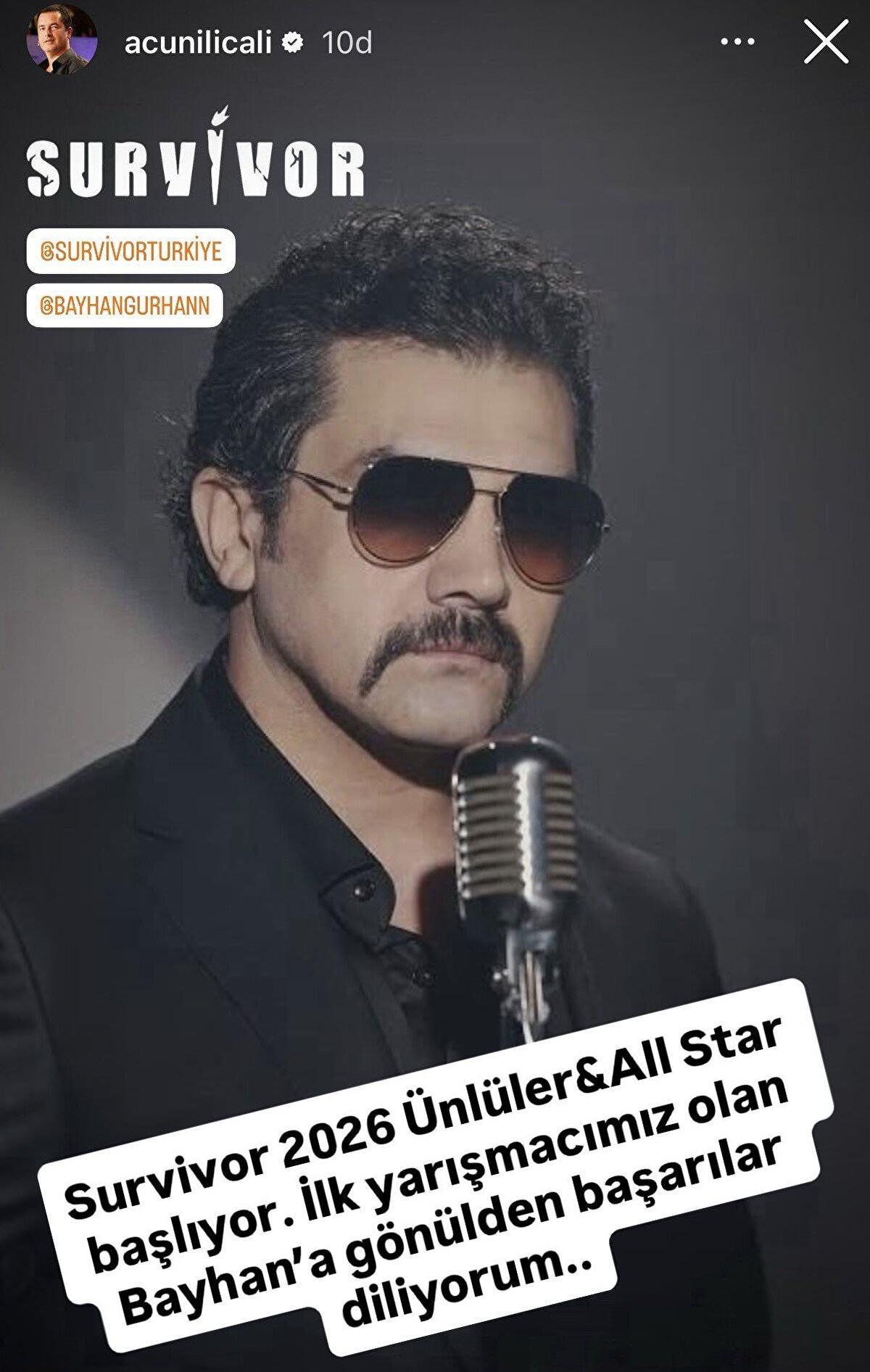 Ilıcalı survivor 2026 yarışmasına gidecek olan ilk ismi açıkladı. Ünlüler-All Star konsepti ile ekranlarda olacak programın ilk yarışmacısı Bayhan Gürhan oldu. Acun Ilıcalı paylaşımında şu ifadeleri kullandı: