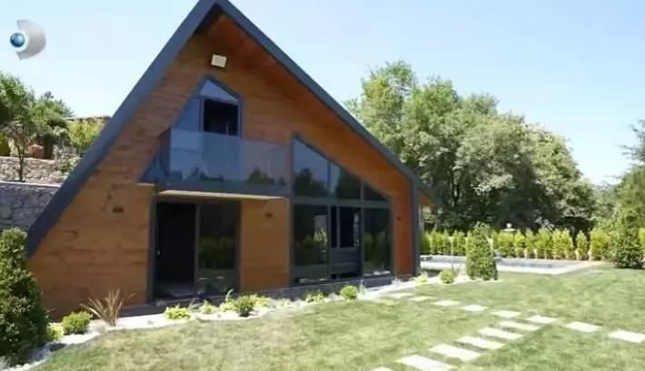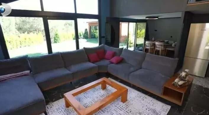 2 oda 1 salondan oluşan bağ evinde sıcak ve modern dokunuşları bir arada kullanmayı tercih eden ünlü ismin salonunda koyu tonlar göze çarpıyor. Geniş gri renkli bir L koltuk ile bordo kırlentlerin uyumunu yakalayan ünlü isim, ahşap sehpa ve beyaz televizyon ünitesiyle uyumlu bir salon dekore etmiş.
