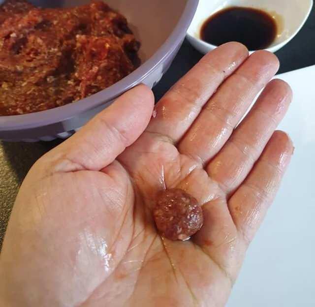 Kıymayı tuz, karabiber ve diğer baharatlarla yoğurun. Fındık büyüklüğünde parçalar koparıp nar ekşisine bulayın ve elinizle top şeklini verin.