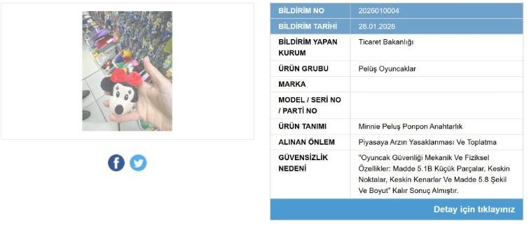 Son olarak insan sağlığını tehdit eden ve risk taşıdığını belirtilen çocukların gözdesi olan ‘Minnie Peluş Ponpon Anahtarlık’ şeklindeki popüler oyuncak güvensiz bulundu.