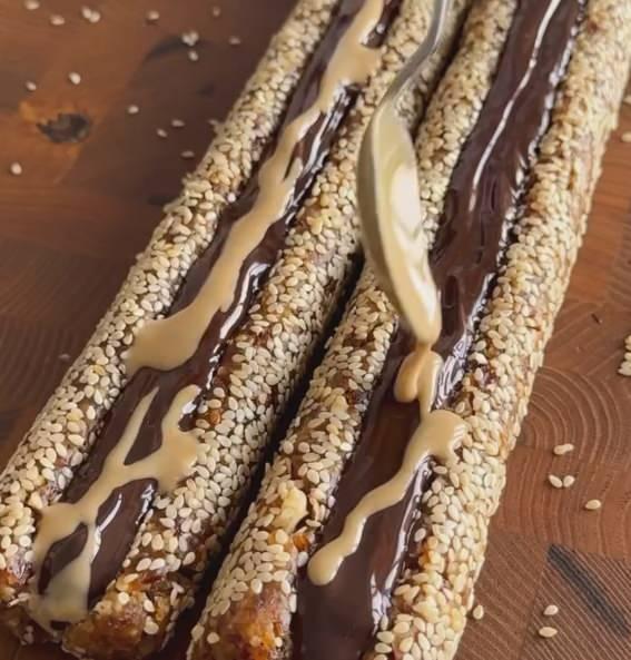 Her parçayı fitil şeklinde uzatın ve her tarafını susama bulayın.