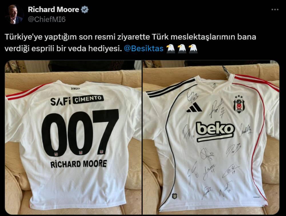 Geçtiğimiz günlerde Türkiye’ye resmi ziyarette bulunan İngiliz Dış İstihbarat Servisi MI6 Başkanı Richard Moore’a Türk meslektaşlarından özel bir jest geldi. Görevi sona eren Moore’a esprili bir vedada bulunmak isteyen meslektaşları, Beşiktaş taraftarı olduğu bilinen isme, 007 numaralı Beşiktaş forması hediye etti.