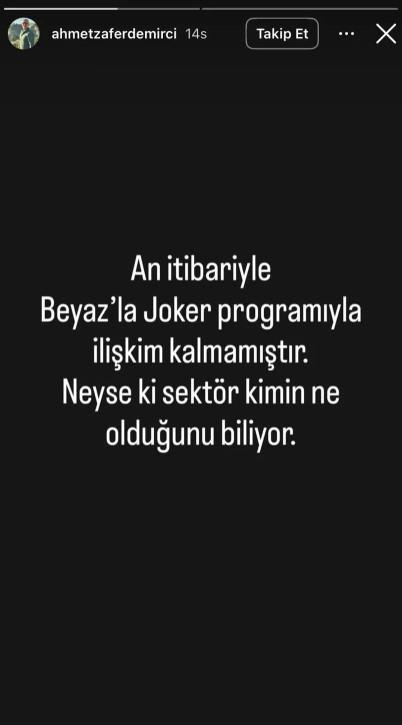 “An itibarıyla Beyaz’la Joker programıyla ilişkim kalmamıştır. Neyse ki sektör kimin ne olduğunu biliyor.” ifadelerini kullandı.