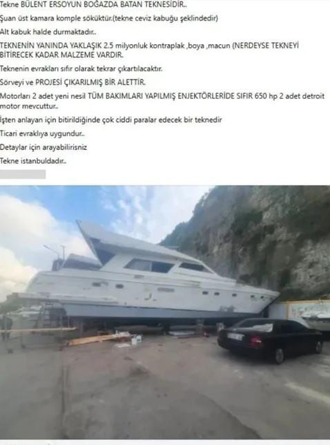 Bir tekne sahibi tarafından verilen ilanda, “Tekne, Bülent Ersoy’un Boğaz’da batan teknesidir. 24 metre ahşaptır. İstanbul’dadır ve ticari evrakları uygundur” ifadelerine yer verildi.