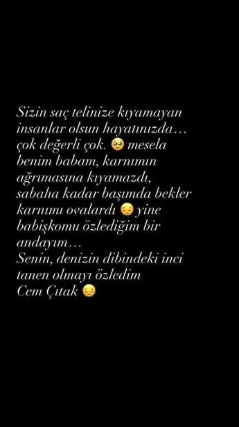 “Sizin saç telinize kıyamayan insanlar olsun hayatınızda… Çok değerli çok. Mesela benim babam, karnımın ağrımasına kıyamazdı, sabaha kadar başımda bekler karnımı ovalardı. Yine babişkomu özledim bir andayım… Senin, denizin dibindeki inci tanen olmayı özledim. Cem Çıtak.”
