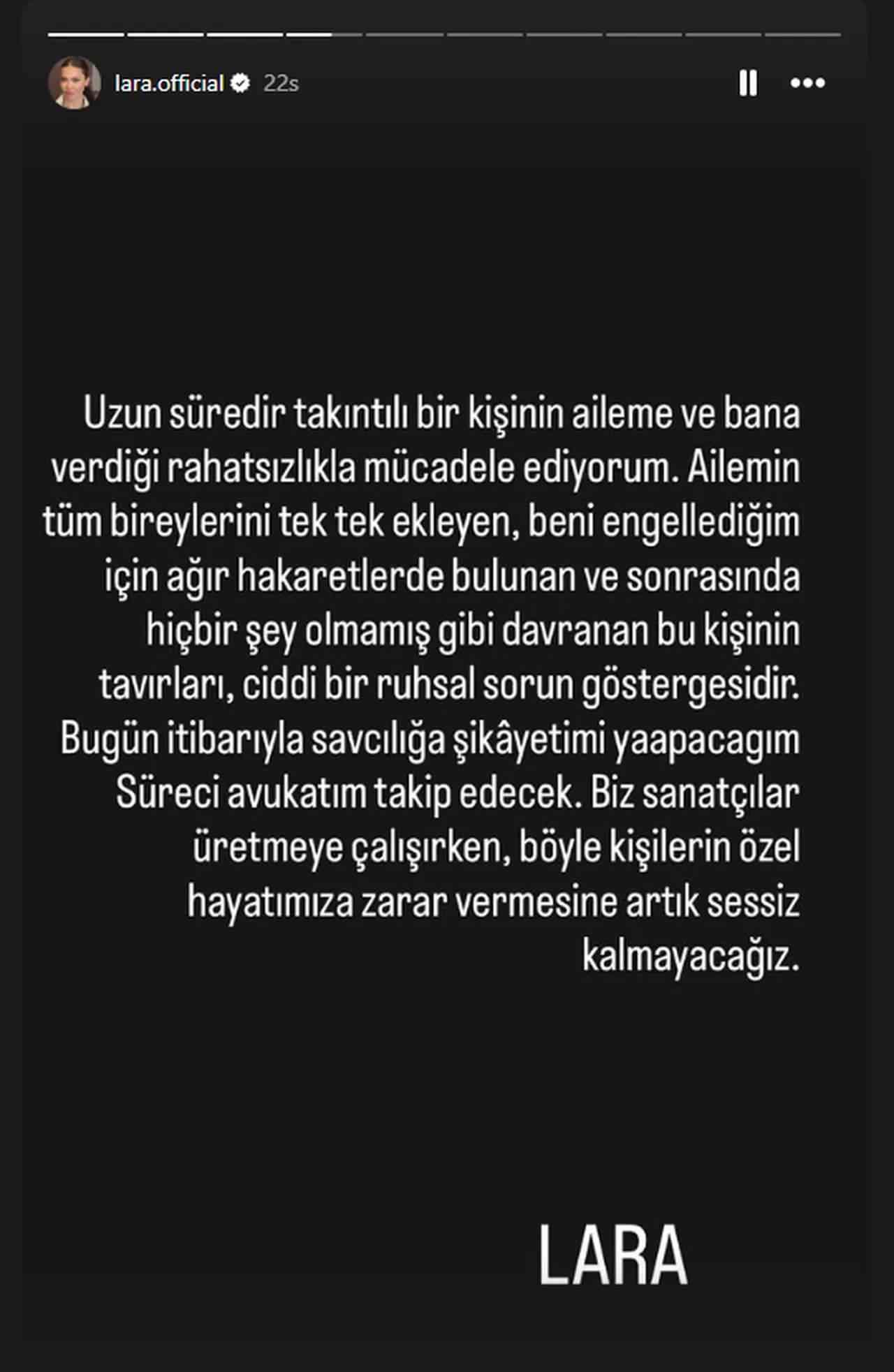 Ünlü şarkıcı Lara sosyal medya hesabı üzerinden uzun süredir kendisini ve ailesini rahatsız eden kişi hakkında suç duyurusunda bulunacağını açıkladı. Lara, sevenlerini bilgilendirmek için yaptığı açıklamada şu ifadeyi kullandı: