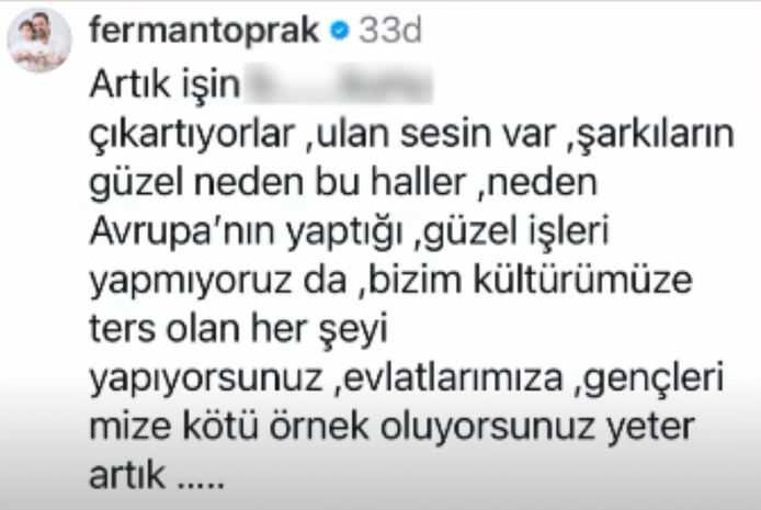 Ünlü ismin kıyafet seçimine oldukça sinirlenen ünlü şarkıcı Ferman Toprak, sosyal medya hesabından yaptığı paylaşımla adeta ateş püskürdü.