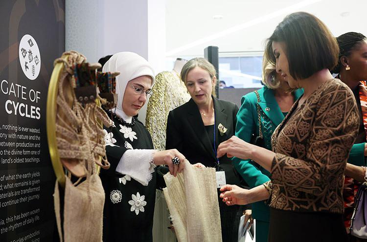 Emine Erdoğan ve lider eşleri, program kapsamında ilk olarak, Sanayi ve Teknoloji Bakanlığının öncülüğünde gerçekleştirilen ve Anadolu’nun binlerce yıllık bilgi, zanaat ve kültür birikimini bugünün tasarım anlayışıyla buluşturan sergiyi gezdi. 40’a yakın geleneksel kumaş, el yapımı kilimler, telkari ve kazaziye takılar, çini örnekleri, ceviz sandıklar ve el dövmesi bakır kaplar gibi çok sayıda kültürel miras ürününün yer aldığı sergi, büyük beğeni topladı.