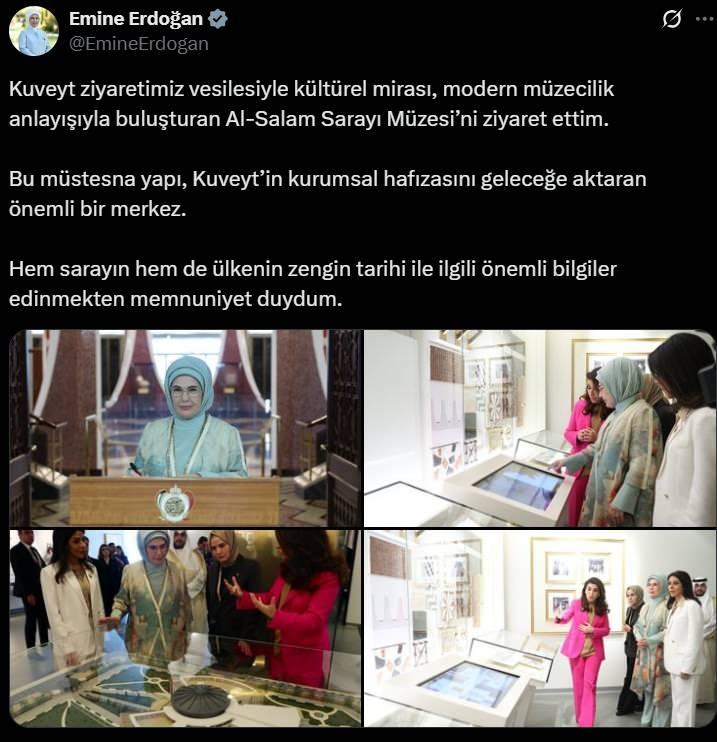 Emine Erdoğan X Sosyal hesabından yaptığı paylaşımda, “Kuveyt ziyaretimiz vesilesiyle kültürel mirası, modern müzecilik anlayışıyla buluşturan Al-Salam Sarayı Müzesi’ni ziyaret ettim. Bu müstesna yapı, Kuveyt’in kurumsal hafızasını geleceğe aktaran önemli bir merkez. Hem sarayın hem de ülkenin zengin tarihiyle ilgili önemli bilgiler edinmekten memnuniyet duydum.” ifadelerine yer verdi.