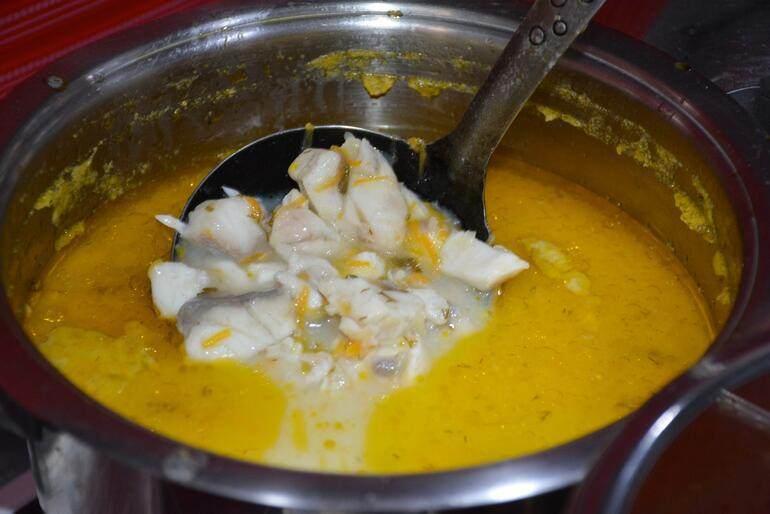 Kaynamaya başlayıp kıvamı yoğunlaşınca haşlanıp iri didilmiş balıklar eklenerek bir taşım kaynatılır. Ocaktan alınır.