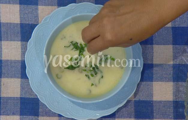 İnce kıyılmış kereviz yaprağı ile üzeri süslenerek sıcak sıcak servis edilir.