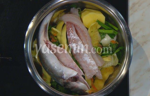 İyice yıkanan sebzelerin kabukları tencereye koyularak levrekler en üste yerleştirilerek 6 bardak su ile haşlanır.