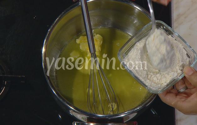 Başka bir tencerede tereyağı ve zeytinyağı ile un kavrulur.