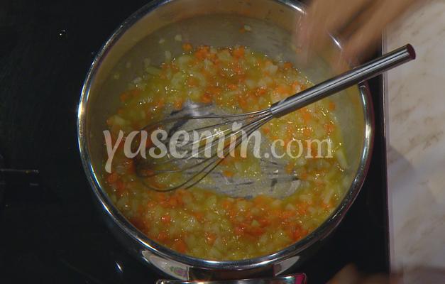 Küp doğranmış havuç ve kereviz sapı da eklenerek karıştırılır.