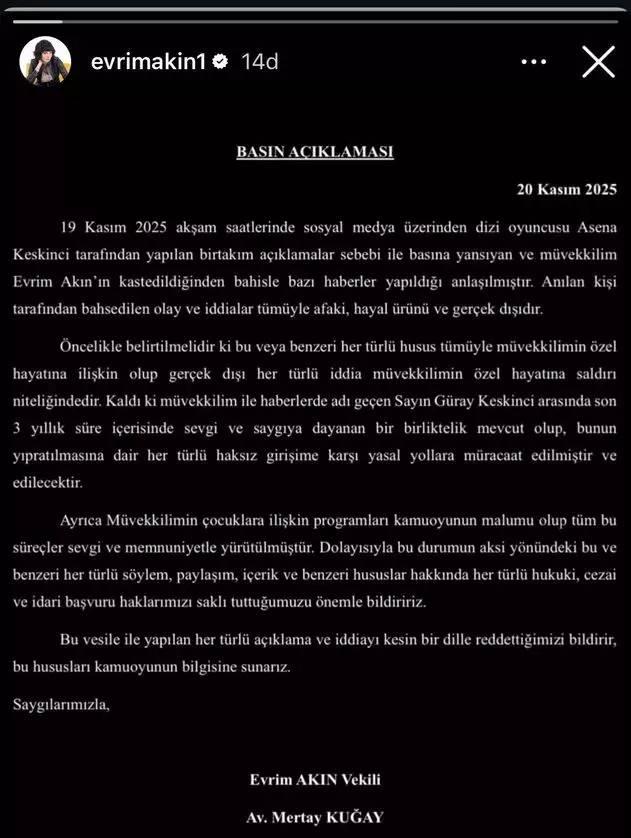 Konuyla ilgili sessizliğini bozan Evrim Akın, avukatı aracılığıyla yazılı bir açıklama yaparak iddiaları kesin bir dille yalanladı. Açıklamada, Keskinci’nin paylaşımlarının “asılsız, hayal ürünü ve tamamen gerçek dışı” olduğu ifade edildi.