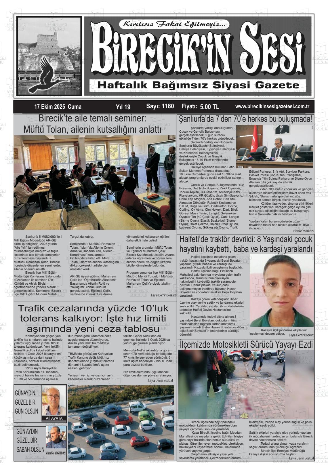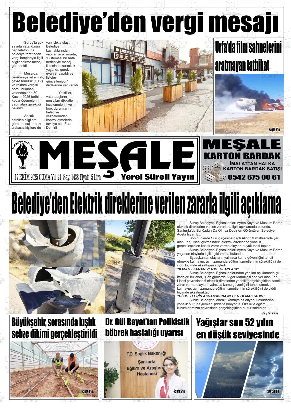 Şanlıurfa Yerel Gazeteleri 17 Ekim 2025, Cuma Günü Manşeti