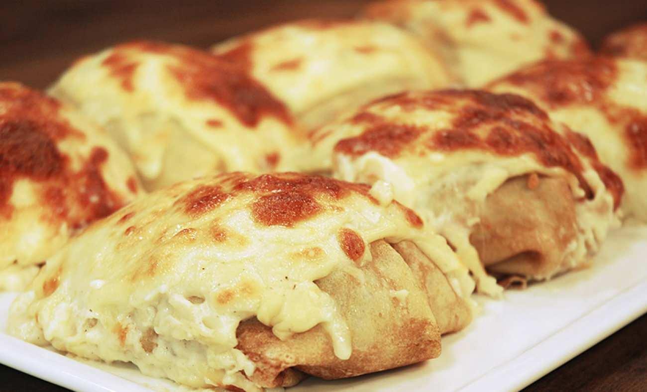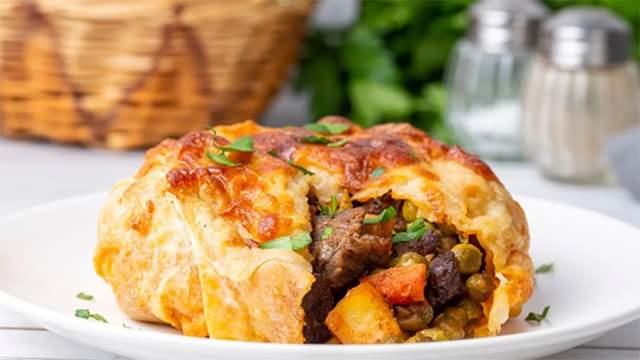 Krepin ortasına 3 yemek kaşığı et harcı koyun, kenarlarını kapatıp bohça şekli verin. Yağlanmış fırın tepsisine dizin.