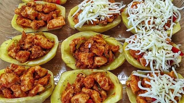 Fırında ön pişirme yaptığınız patateslerin orta kısımlarına tavuklu harcı paylaştırın. Üzerlerine beşamel sos dökün ve bolca rendelenmiş kaşar peyniri serpin.
