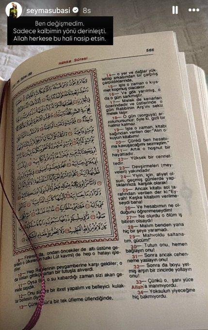 Ünlü isim, söz konusu paylaşımın ardından bir kez daha Kur’an-ı Kerim okuduğu anları sosyal medya hesabından paylaştı. Kur’an-ı Kerim’den bir sayfayı takipçileriyle paylaşan Subaşı, “Ben değişmedim; sadece kalbimin yönü derinleşti. Allah herkese bu hali nasip etsin” notunu yazdı.