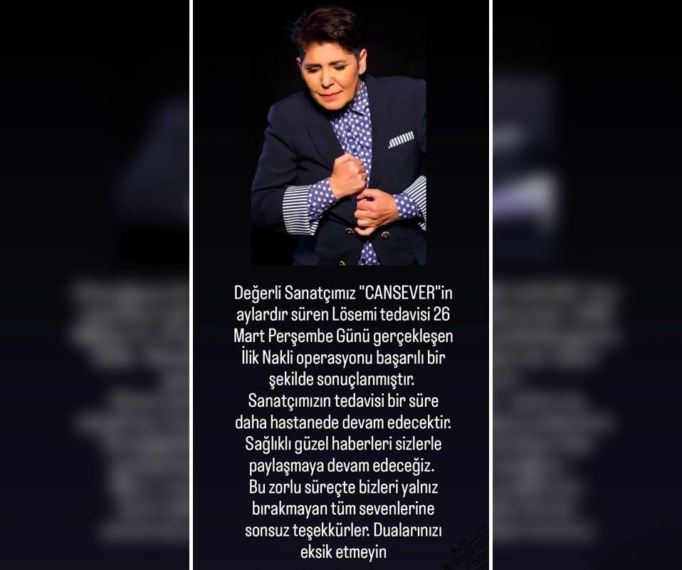 Ameliyat sonrası ünlü sanatçıdan sevindiren haberi ise menajeri Erhan Arı verdi. Arı, sosyal medya hesabından yaptığı “Cansever’in aylardır süren lösemi tedavisi, 26 Mart perşembe günü gerçekleşen ilik nakli operasyonu ile başarılı bir şekilde sonuçlanmıştır. Tedavisi bir süre daha hastanede devam edecektir. Bu süreçte destek olan tüm sevenlerimize teşekkür ederiz. Dualarınızı eksik etmeyin.” açıklamasıyla Cansever’in ameliyatının başarılı geçtiğini duyurdu.