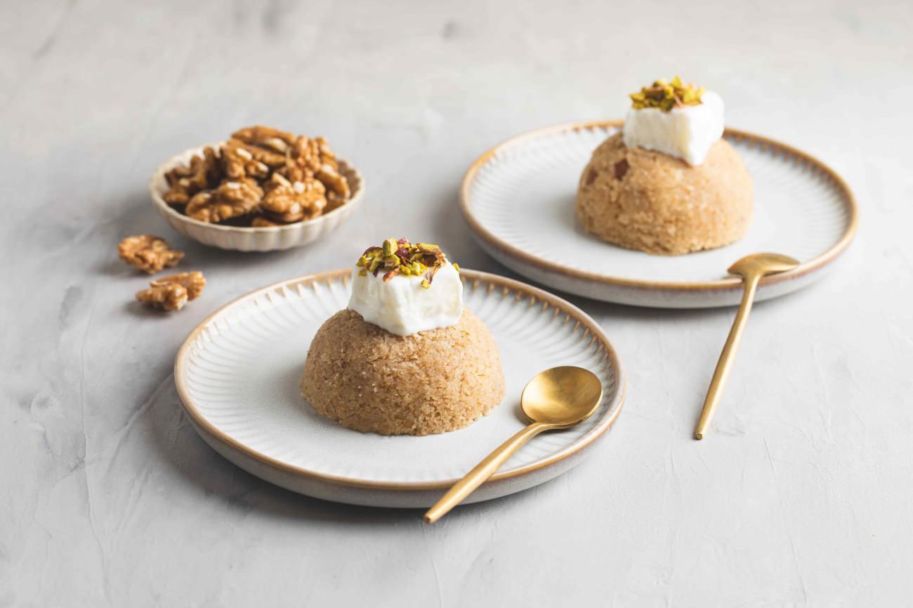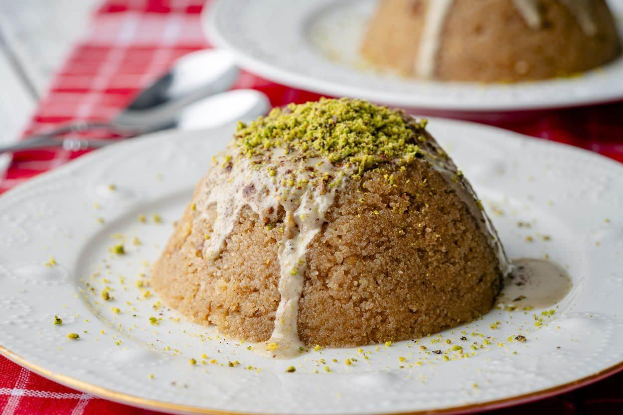 20 dakika dinlenen kakuleli irmik helvasını tahin ve Antep fıstığı ile servis edin.