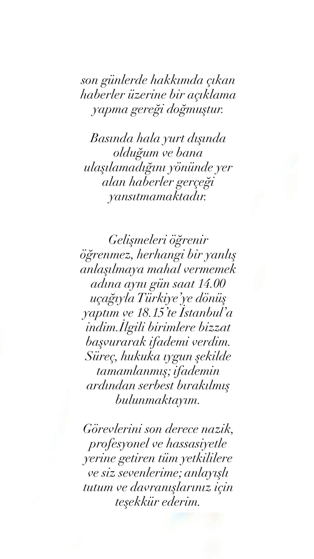 Gelişmeleri öğrenir öğrenmez, herhangi bir yanlış anlaşılmaya mahal vermemek adına aynı gün saat 14.00 uçağıyla Türkiye’ye dönüş yaptım ve 18.15’te İstanbul’a indim. İlgili birimlere bizzat başvurarak ifademi verdim. Süreç, hukuka uygun şekilde tamamlanmış; ifademin ardından serbest bırakılmış bulunmaktayım.