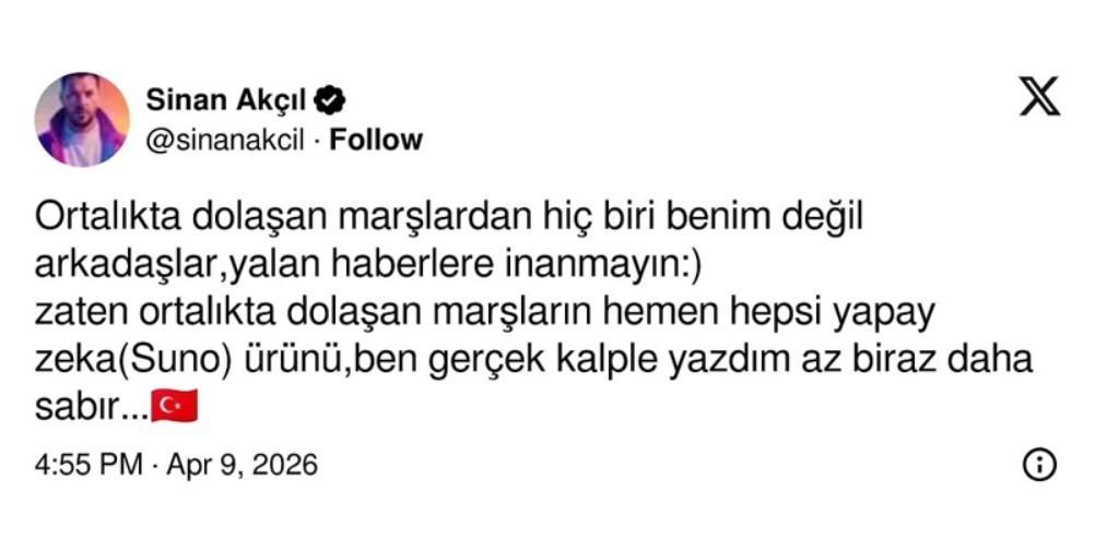 Sosyal medyada dolaşan birden çok marş hakkında ‘Onlar yapay zeka’ diyen Sinan Akçıl yeni marş yaptığını şu sözlerle açıkladı: