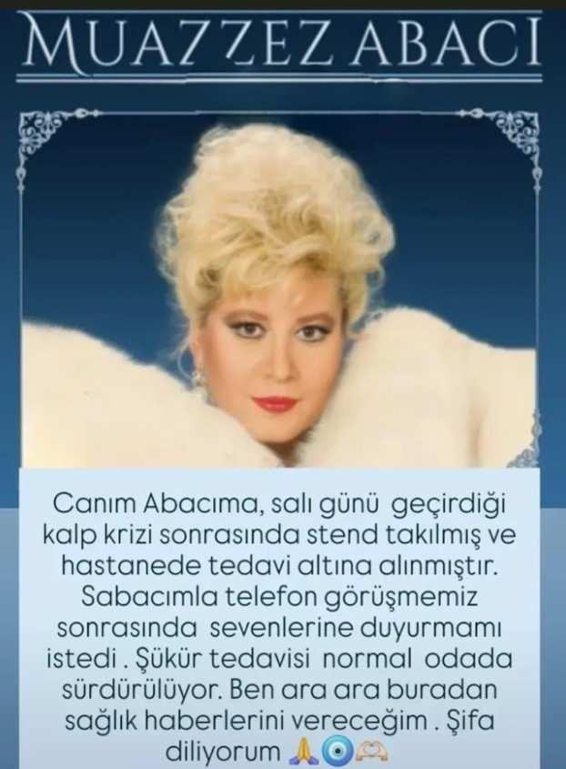 “Sanatçımız Sayın Muazzez Abacı geçtiğimiz hafta kalp rahatsızlığı nedeni ile anjiyo olmuş ve stent tedavisi uygulanmıştı. Tedavisine normal odada devam ediliyordu. Ancak bugün yapılan kontrollerde anjiyo sırasında verilen kontrastlı sıvının böbreklerinde sorun yarattığı ortaya çıkmıştır. Böbrekler görevini tam anlamıyla yapamadığı için ciğerleri su toplamıştır. Bu sebeple nefes alma sorunu ortaya çıkmıştır. Tedavisine yoğun bakımda devam edilmektedir. Bu süreçte tüm dualarımız Muazzez Abacı için.”