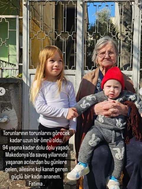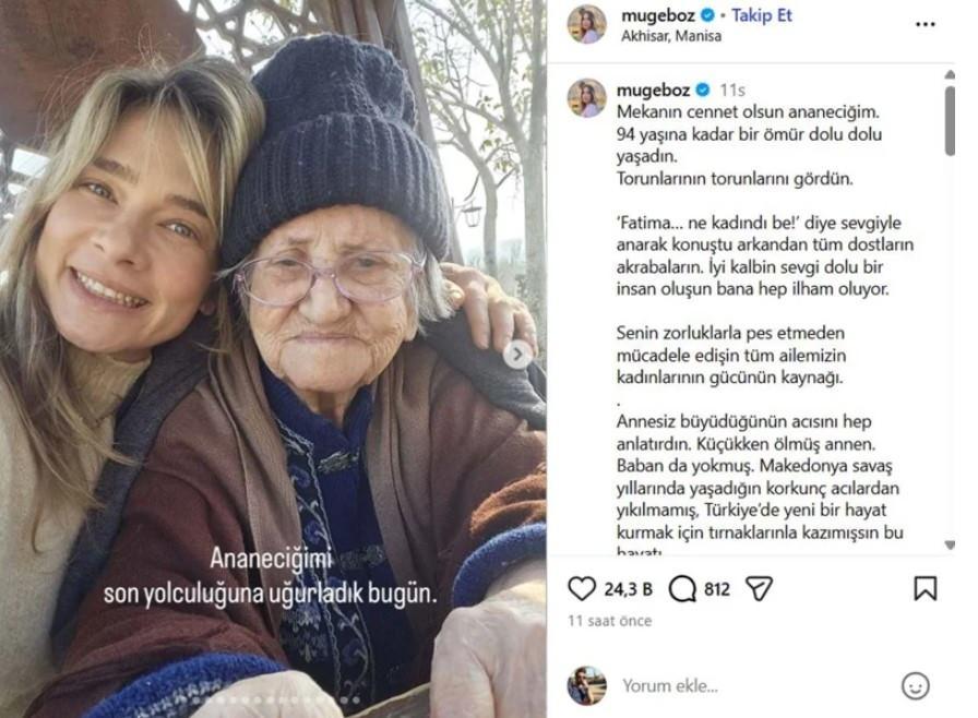 Müge Boz paylaşımında, “Mekanın cennet olsun ananeciğim. 94 yaşına kadar bir ömür dolu dolu yaşadın. Torunlarının torunlarını gördün. ‘Fatima… ne kadındı be!’ diye sevgiyle anarak konuştu arkandan tüm dostların, akrabaların. İyi kalbin, sevgi dolu bir insan oluşun bana hep ilham oluyor” dedi.