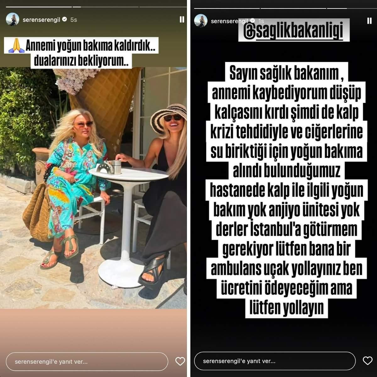 Seren Serengil, sosyal medya hesabından yaptığı paylaşımla annesinin yoğun bakıma kaldırıldığını duyurmuştu. Hastanenin yetersiz olduğun söyleyen Serengil, sosyal medya hesabından yaptığı paylaşımla Sağlık Bakanlığı’na seslenmişti.