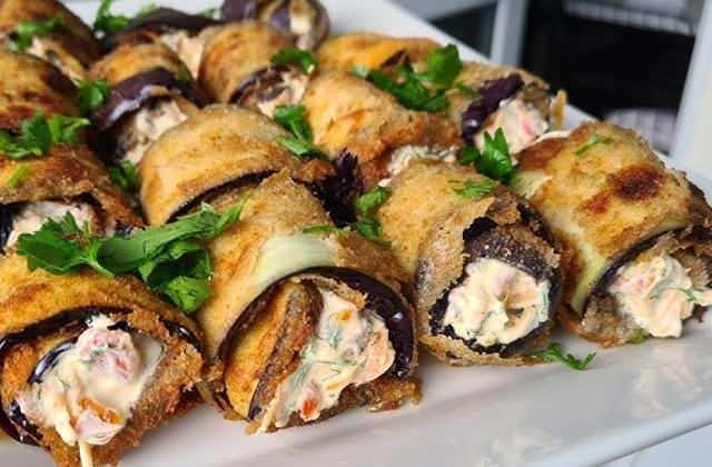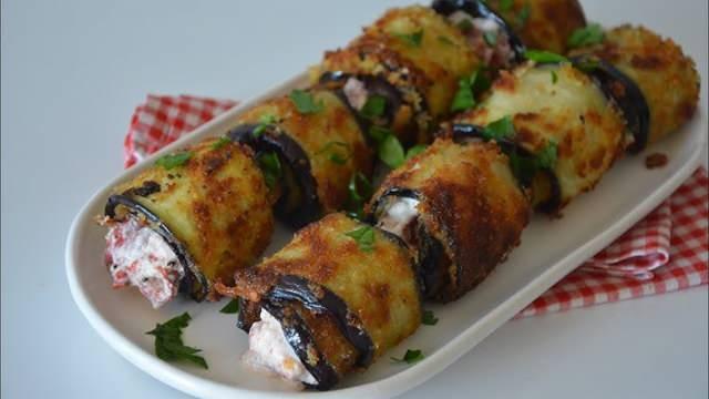 Kızarmış patlıcan dilimlerinin içine hazırladığınız harçtan bir tatlı kaşığı kadar koyun ve rulo şeklinde sarın. Uçları alta gelecek şekilde servis tabağına yerleştirin.