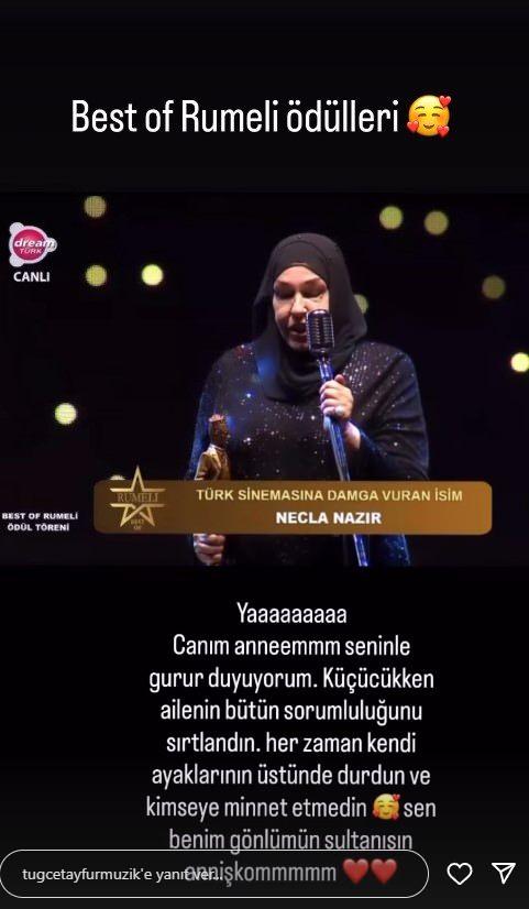 Yeşilçam’ın usta isimlerinden Necla Nazır’ın ödül aldığı anları Instagram hesabında paylaşan Tuğçe Tayfur, “Canım annem seninle gurur duyuyorum. Küçükken ailenin bütün sorumluluğunu sırtlandın. Her zaman ayaklarının üstünde durdun ve kimseye minnet etmedin. Sen benim gönlümün sultanısın.” ifadelerine yer verdi.