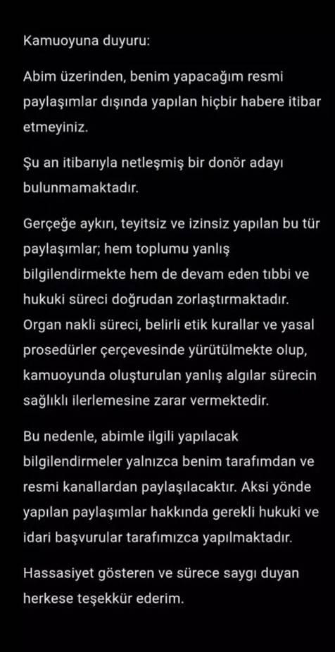 Ağabeyi Ufuk Özkan için netleşmiş bir donör adayı bulunmadığını belirten Özkan açıklamasında, “Ağabeyim üzerinden, benim yapacağım resmi paylaşımlar dışında yapılan hiçbir habere itibar etmeyiniz. Şu an itibarıyla netleşmiş bir donör adayı bulunmamaktadır. Gerçeğe aykırı, teyitsiz ve izinsiz yapılan bu tür paylaşımlar; hem toplumu yanlış bilgilendirmekte hem de devam eden tıbbi ve hukuki süreci doğrudan zorlaştırmaktadır. Organ nakli süreci, belirli etik kurallar ve yasal prosedürler çerçevesinde yürütülmekte olup, kamuoyunda oluşturulan yanlış algılar sürecin sağlıklı ilerlemesine zarar vermektedir. Bu nedenle, ağabeyimle ilgili yapılacak bilgilendirmeler yalnızca benim tarafımdan ve resmi kanallardan paylaşılacaktır. Aksi yönde yapılan paylaşımlar hakkında gerekli hukuki ve idari başvurular tarafımızca yapılmaktadır. Hassasiyet gösteren ve sürece saygı duyan herkese teşekkür ederim” ifadelerini kullandı.
