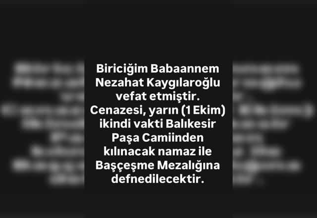 “Biriciğim babaannem Nezahat Kaygılaroğlu vefat etmiştir. Cenazesi, yarın (1 Ekim) ikindi vakti Balıkesir Paşa Camii’nden kılınacak namaz ile Başçeşme Mezarlığı’na defnedilecektir.”
