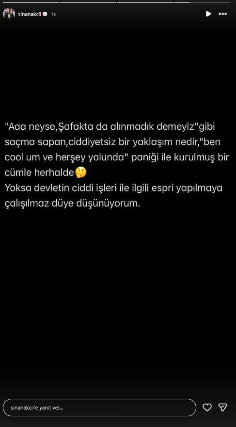 “‘Aaa neyse, şafakta da alınmadık demeyiz’ gibi saçma sapan, ciddiyetsiz bir yaklaşım nedir? ‘Ben cool’um ve her şey yolunda’ paniği ile kurulmuş bir cümle herhalde. Yoksa devletin ciddi işleri ile ilgili espri yapılmaya çalışılmaz diye düşünüyorum.”